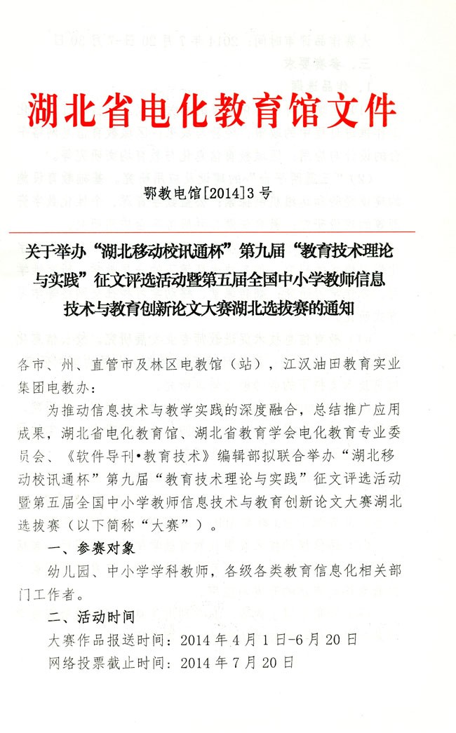 关于“湖北移动校讯通杯”第九届“教育技术理论与实践”征文评选活动暨第五届全国中小学教师信息技术与教育创新论文大赛湖北选拔赛的通知