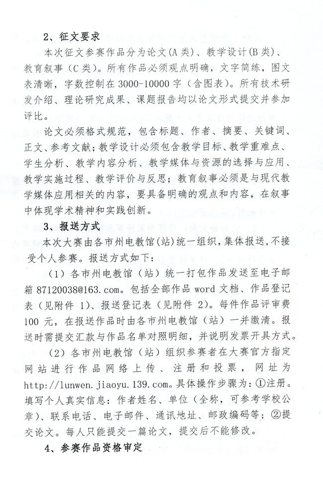 1、本次征文参赛作品分为论文(A类)、教学设计(B类)、教育叙事(C类)。均必须观点明确,文字简练,图文表清晰,字数控制在3000-10000字(含图表),所有技术研发介绍、理论研究成果、课题报告均以论文形式提交并参加评比。