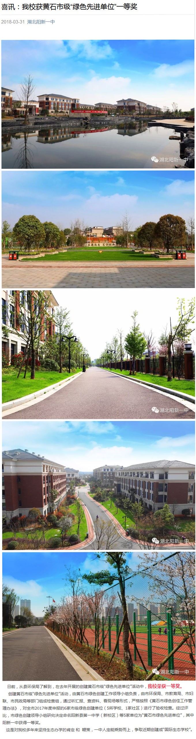 喜讯:我校获黄石市级“绿色先进单位”一等奖